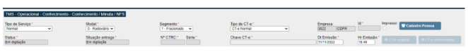 Caminho no sistema para a emissão: TMS- Operacional- Conhecimento- Conhecimento- Minuta/ NFS