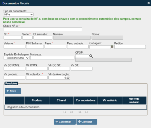 Preencher o Campo NF, após informar a chave é preenchido pelo sistema;