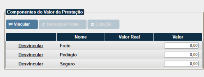 No Campo Vlr receber, Vlr base ICMS, Alíquota ICMS, Vlr ICMS, será calculado automaticamente pelo sistema, conforme os valores de frete que você informar.