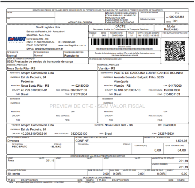 Desta maneira o sistema irá gerar uma pré-visualização de como ficara CT-e e poderá ser enviado para validação. Apresentando uma tarja de CT-e sem valor fiscal