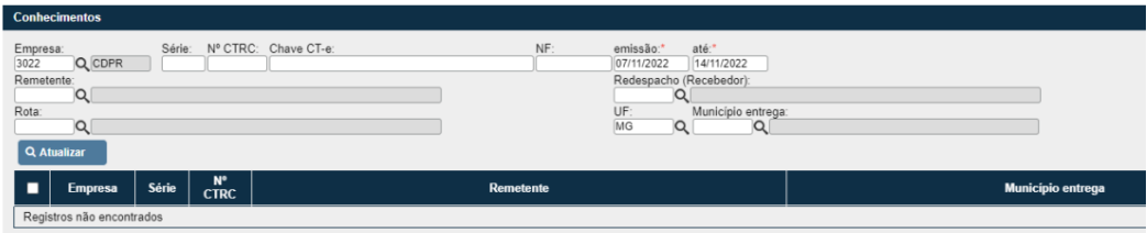 Preencha os campos que achar necessário para a localização do CT-e e clicar no botão atualizar;