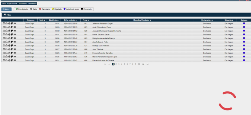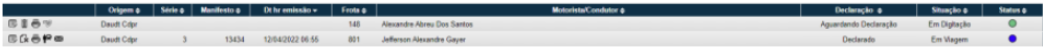 Deve-se observar as “bolinhas” coloridas sinalizando o status dos seus MDF-e, segue abaixo a imagem do sistema.