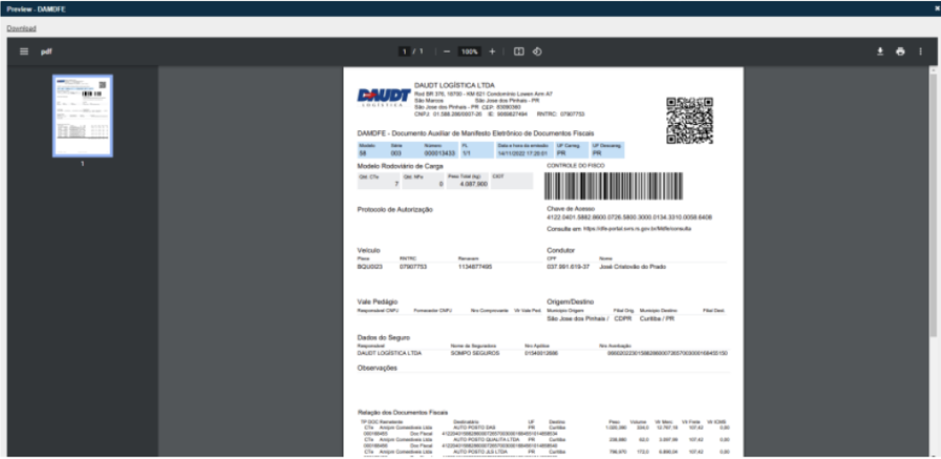 Caso o MDF-e seja autorizado, automaticamente abrirá uma tela para você, mostrando o MDF-e que foi emitido e autorizado. Se você deseja salvá-lo, deverá clicar no botão Download que está sinalizado no canto esquerdo, na imagem abaixo.
