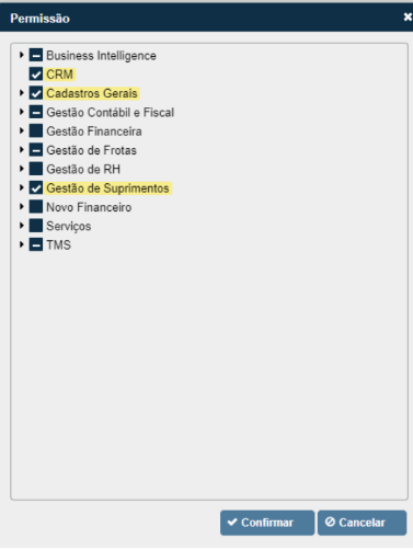 Após isso irá abrir um modal com todos os módulos do sistema, escolha os módulos que determinado grupo de usuário terá acesso e clique em salvar. Como mostra a imagem abaixo: