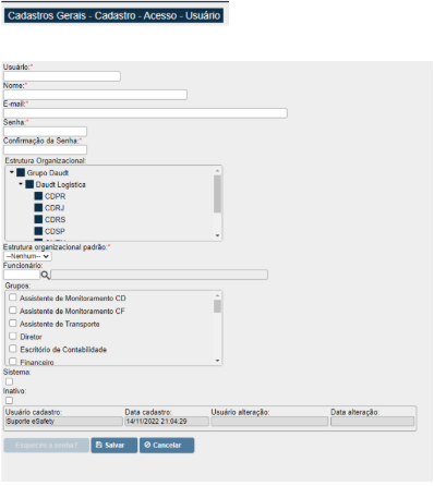 Preencher os dados em asterisco, escolher a estrutura organizacional ao qual pertencera, escolher os grupos onde será dada as devidas permissões a cada usuário e clique em salvar.