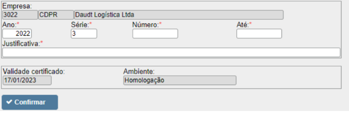 Informe o número inicial e o número final e digite a justificativa e clique em confirmar, após isso o intervalo desejado será inutilizado.