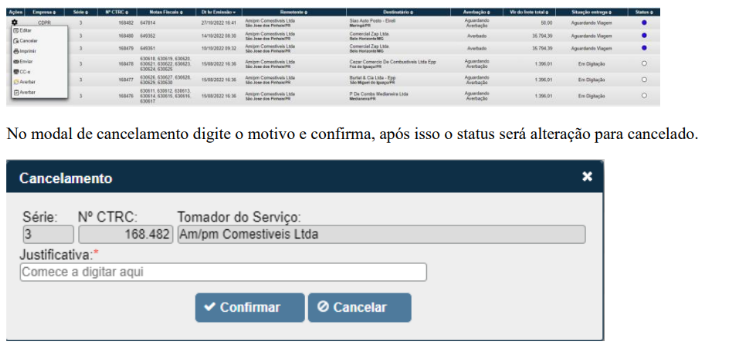 Valide o número do CT-e que necessita ser cancelado e clique na engrenagem e procure a opção cancelar: